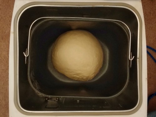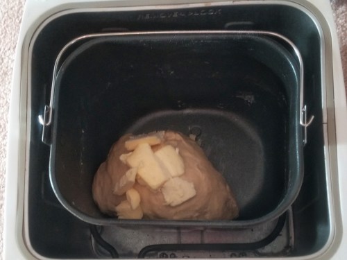 When a smooth dough starts to develop, add in salt and softened butter. Resume kneading cycle until a thin translucent membrane can be seen if you stretch a piece of dough. Let the dough perform its first rise in the bread machine until doubled in size.