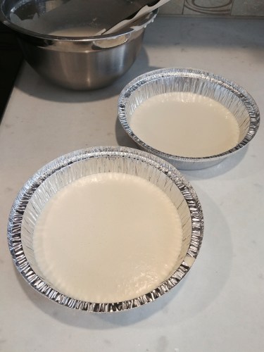 Preheat oven to 325ºF/165ºC. Grease the bottom and sides of the foil pans. Set aside.