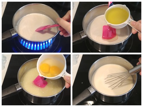 Combine sugar, milk and coconut cream in a saucepan and cook over medium-low heat until sugar is dissolved. When mixture is no longer hot, whisk in the oil and eggs until combined.