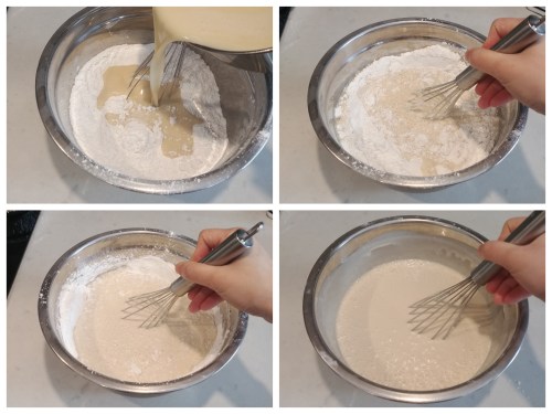 Combine and sift the flours and baking powder in a large mixing bowl and make a well in the center. Pour in the above mixture and whisk until smooth and thoroughly combined. Strain batter to get rid of any lumps if needed.