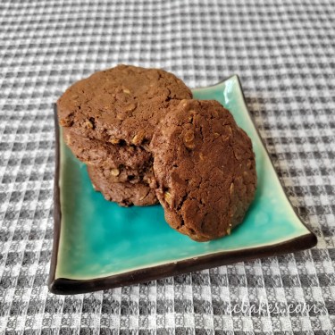 麵粉、單一小麥麵粉、可可粉和梳打粉混合過篩,分兩次加入上述混合物中,低速拌至大致上均勻,加入燕麥片和朱古力粒輕手拌勻, 用保鮮紙室包好麵團, 放在雪櫃冷藏至少一小時或至麵團不黏手。