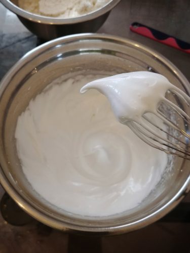 製作蛋白霜前先將打蛋器配件及鋼盆用廚房紙沾點白醋或檸檬汁抹一次去除殘餘油污,鋼盆內放進一半蛋白、糖、他他粉(如用)和鹽,小鍋內加水煮至微滾,將鋼盆放在小鍋上,開小火隔水加熱至140°F/ 60°C,其間要常常攪拌以免煮熟蛋白,離火後用電動打蛋器將蛋白高速打發至溫度下降、有光澤、挺身、末端有小尾包的蛋白霜,末段可加入色膏略打。