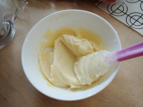 在蛋白霜中加入餘下蛋白及一半杏仁糖粉以切拌方法拌勻,加入餘下杏仁糖粉拌至不見粉粒後便可開始壓拌混合(macoronage)。用膠刮把麵糊壓往盆邊(作用是壓出氣泡令麵糊順滑),再把麵糊刮回盆子中央並把盆底的麵糊翻到上面,重覆壓拌動作並觀察麵糊流動狀況,若麵糊光亮呈濃稠狀,用膠刮翻起時如緞帶般整片滑落成摺疊狀而痕跡在30秒內緩慢的沉入麵糊即表示混合完成。