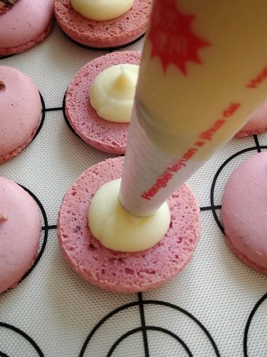 配對形狀相若的馬卡龍,將夾餡裝進已備圓形花嘴的唧花袋中,在其中一塊外殼上唧上霜飾後蓋上另一塊外殼(底部朝下),完成所有馬卡龍後放在密封盒中於雪櫃保存24小時使馬卡龍與夾餡融合,食用前把馬卡龍置室溫15分鐘回溫便可。