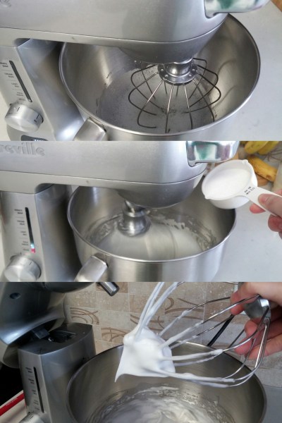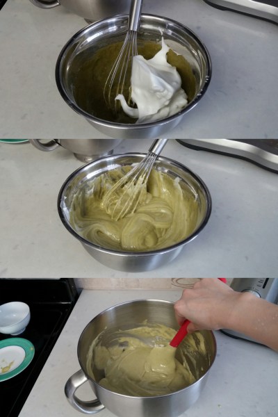 In a clean, separate mixing bowl, whip egg whites with a hand mixer until foamy. Add cream of tartar and continue beating until soft peaks form. Gradually add sugar in batches and continue beating until glossy and firm peaks form. Scoop one third of the meringue to the yolk mixture and mix well to lighten. Then pour this back to the remaining meringue. Fold gently and thoroughly until homogeneous.
