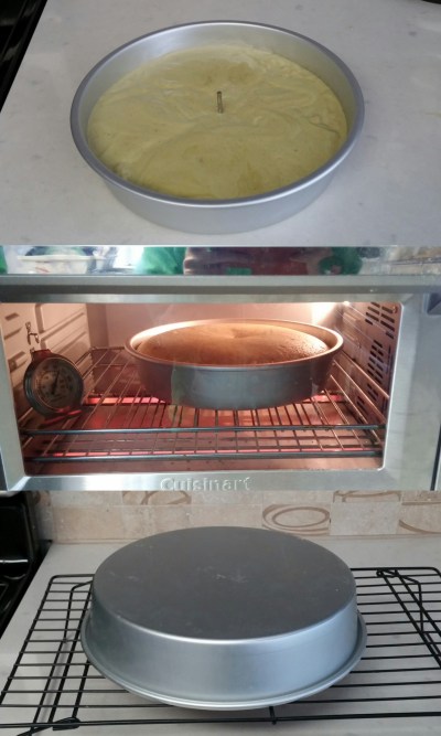 將麵糊倒入已墊底紙的六寸圓模中,用刮刀抹平麵糊表面,將模往枱上輕敲幾下敲出較大的氣泡,放入325°F/160°C預熱焗爐焗至竹籤插入蛋糕中央取出不沾麵糊,約20至25分鐘,取出在鋼架放涼後可脫模,橫切成三片半寸厚蛋糕片(只需使用兩片),以保鮮紙蓋好後放進冰格冷凍過夜。