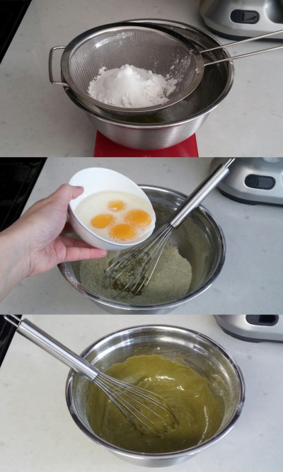 Sift flour and matcha powder together in a mixing bowl. Stir well then make a well in the center. Add oil, milk and egg yolks to the well and whisk gently until combined.