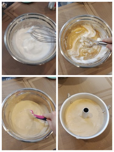 將三分一蛋白霜混入蛋黃糊中用蛋拂以切拌方法充份拌勻,再倒回蛋白霜鋼盆中輕手用膠刮以切拌方法混合至麵糊成均一顔色,盡量輕手並快手完成混合以免蛋白霜消泡。