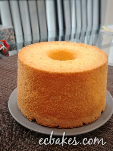這次用了新添置的戚風模,用後立刻愛上了(在此要多謝Karen和Ronny的送贈)!這日本製的加高戚風模比一般戚風模高,煙囪也特別長,可供焗製更高身的戚風蛋糕。 其一體成型的設計方便了清洗,污漬不會殘留在煙囪管接縫中。 不得不提的是模邊的捲邊做工,整個模的邊緣裡裡外外都是超平滑的(是的,EC已把模邊徹底摸過一遍),連底部也是如此,這是Wilton和Nordic Ware中空模都沒有的。EC曾有清洗模具時不小心被模邊鎅破手指頭的經驗,因此十分欣賞日本人的細心,連製造蛋糕模也會注意安全,光是這個貼心的不傷手設計已值五粒星了!倘若大家想購買戚風模,EC真心推介日本品牌!