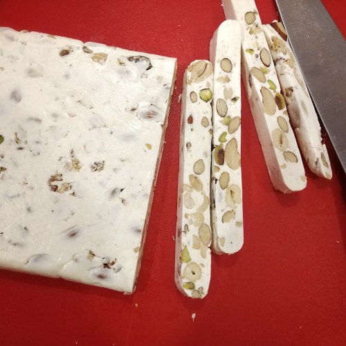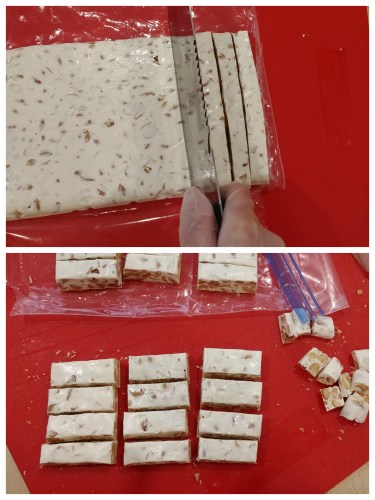 Remove nougat from the bag and cut with a knife first into strips then into rectangles. Wrap nougat pieces individually with wax paper or candy wrappers and store in an airtight container.