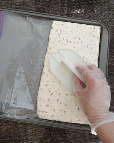 Transfer mixture into a ziploc bag. With the help of a rolling pin (I used a fondant smoother), roll or press the nougat into a rectangle with even layer. Let nougat set at room temperature for about 2 hours to cool.