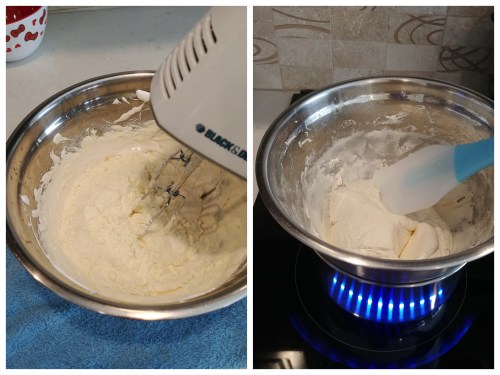 Beat in half of the milk powder on low speed. Place mixing bowl over a pot of simmering water making sure the bowl is not touching the water. Add remaining milk powder and fold with a silicone spatula until incorporated.