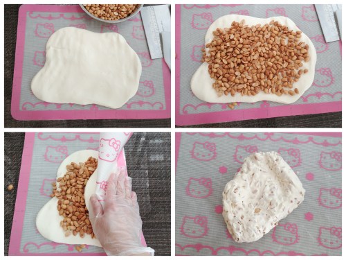 把糖糰刮出放在矽膠墊上略壓平,鋪上溫暖的果仁,拉起矽膠墊把糖糰摺半並輕壓,繼續隔著矽膠墊反覆摺壓糖糰使果仁平均分佈。