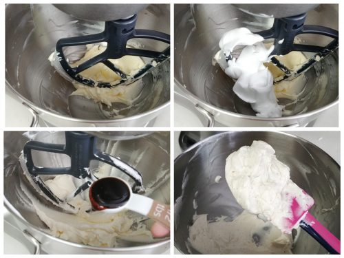 將牛油放在另一鋼盆用電動打蛋器或坐枱式攪拌器(使用攪拌槳配件)打鬆,然後分三次把蛋白霜加進牛油中,每次拌勻後才添加另一次,需要時可用膠刮清理盆底及盆邊,加入雲尼拿醬和咖啡液低速攪拌至完全混合。